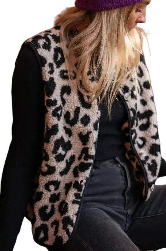 Ta kamizelka ma fason bez rękawów i wzór w panterkę na całej powierzchni. Powierzchnia to teksturowany polar z okrągłym dekoltem. Przednia plisa posiada zapięcia na duże białe guziki. Wycięcia na ramiona i prosta linia dołu zawierają czarne wykończenie lamówką. Na wewnętrznych szwach znajdują się dopasowane kolorystycznie przeszycia.