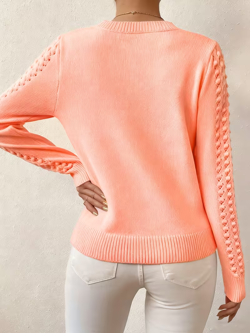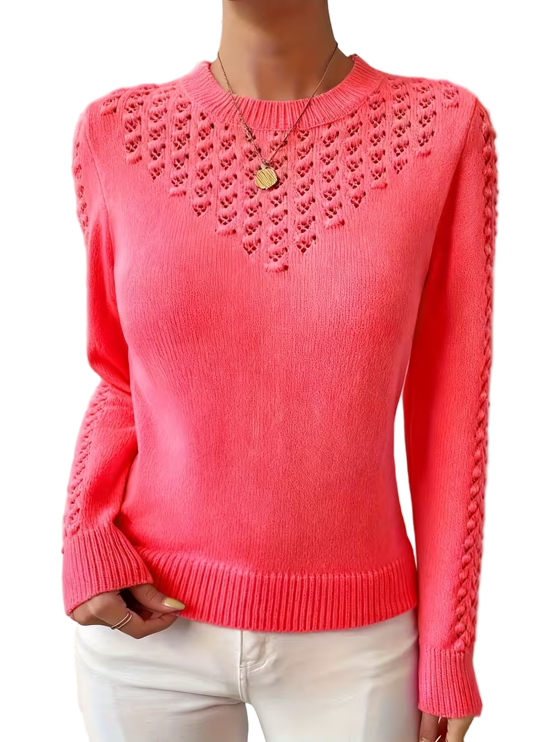 Ten damski sweter ma okrągły dekolt z dekoracyjnym ażurowym panelem na górnej części klatki piersiowej i ramionach, tworzącym kształt litery V w centralnej części przodu. Rękawy posiadają teksturowane ażurowe panele biegnące pionowo na całej długości.